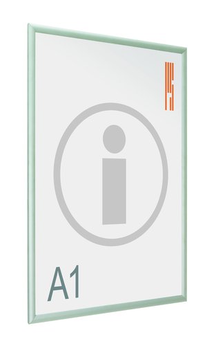 Porta póster con marco abatible de aluminio anodizado plata de 25mm, sistema de apertura clip (para sujetar el poster) trasero de plástico y frontal transparente antirreflejo. Ideal para mostrar o presentar información.